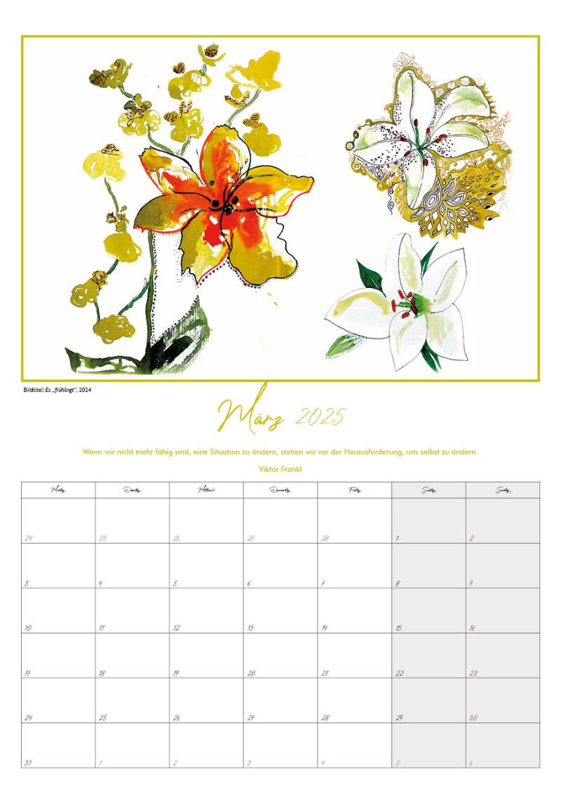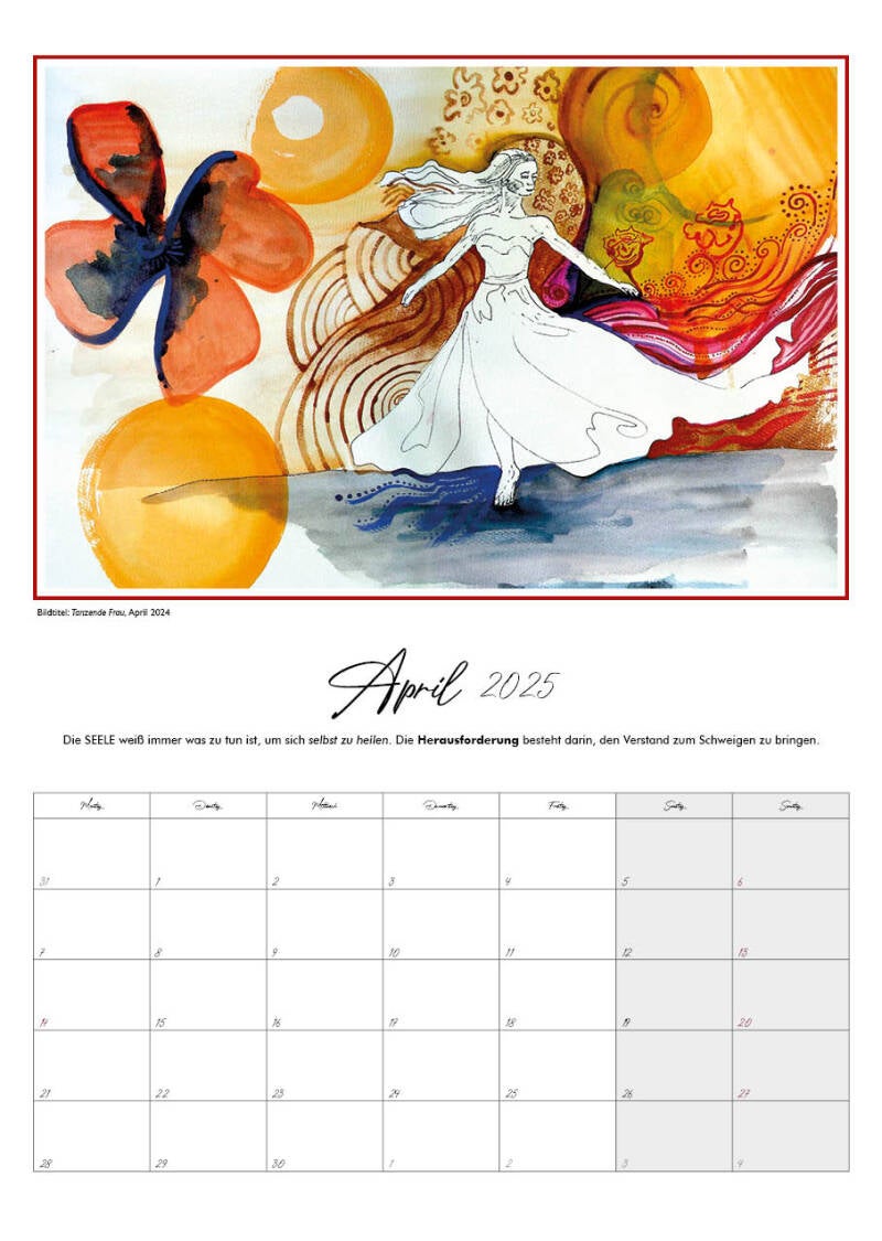 Exklusive Kalender für das Jahr 2025 mit 13 wunderschönen Aquarellbildern. Lassen Sie sich von meiner Kunst inspirieren und durch den Alltag begleiten. Jeder Monat mit einem besonderen Zitat, mit großzügigem Kalendarium für Termine zum Eintragen - so organisieren Sie Ihr Jahr auf stilvolle Weise. Kalendergröße in A3 im Hochformat.